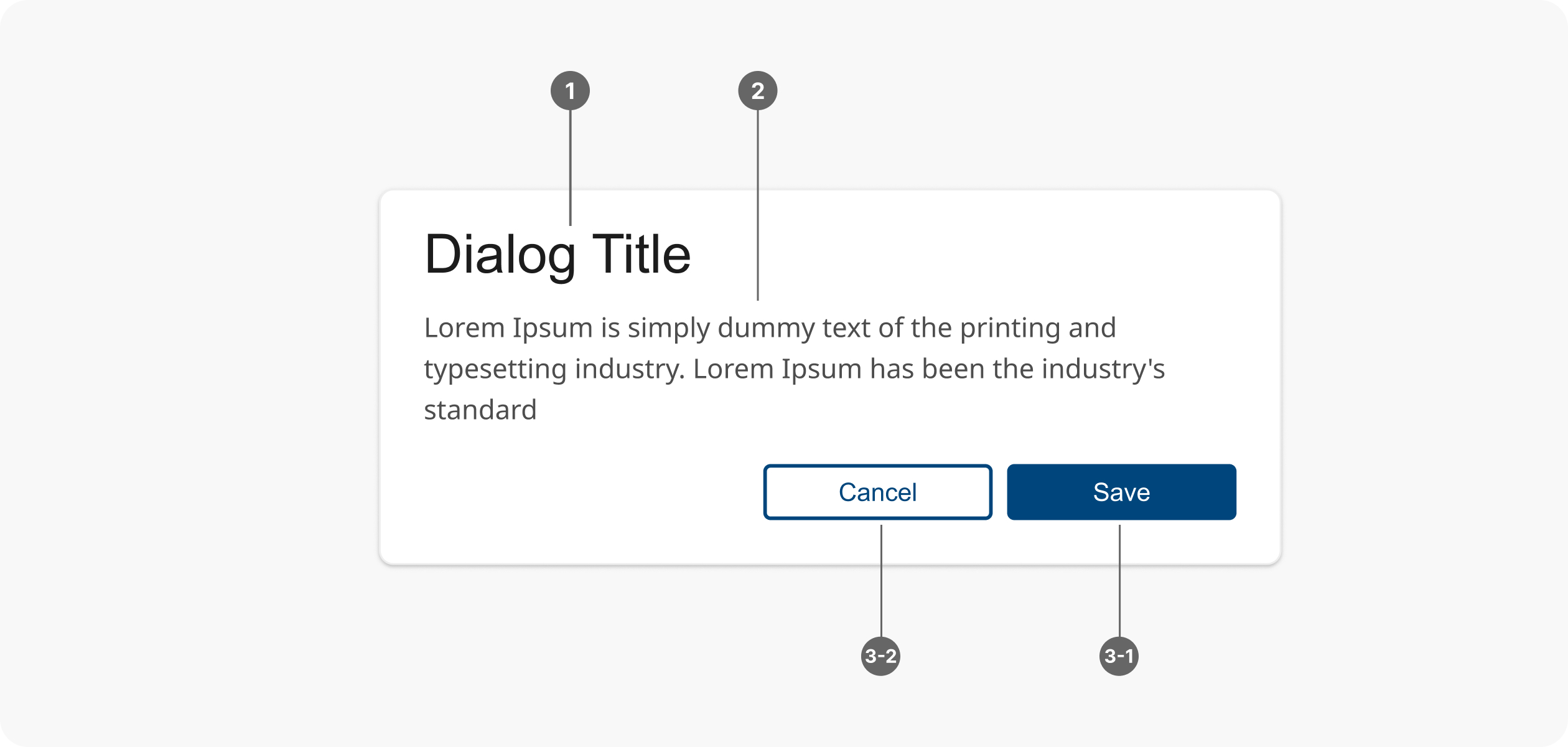 - 關閉方式:對話框需提供明確的關閉方式,例如點擊關閉按鈕、按下 Esc 鍵或點擊對話框外部區域(選擇性)。