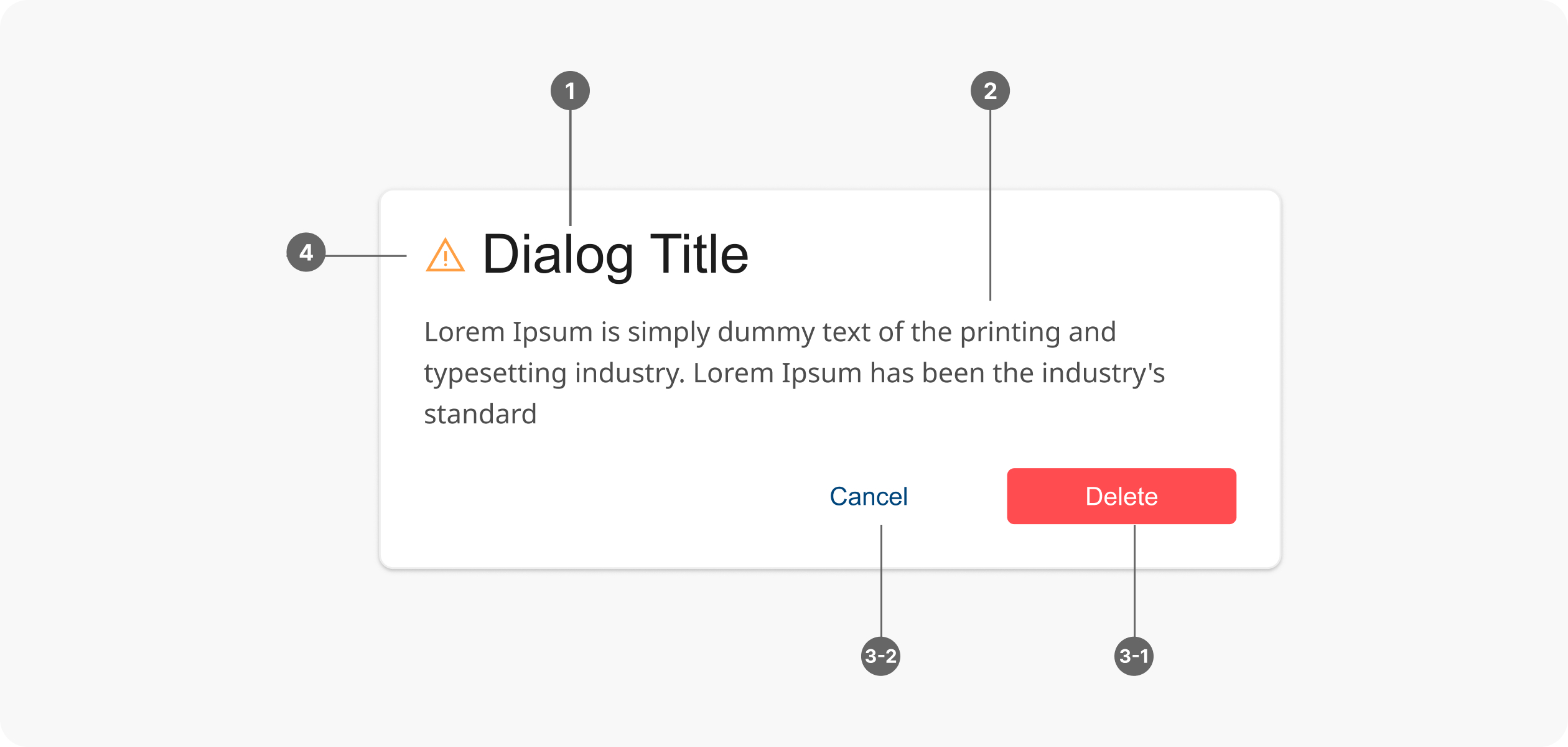 - 輔助文字 (Supporting Text):提供更多上下文或說明,解釋對話框的目的和使用者需要採取的行動。