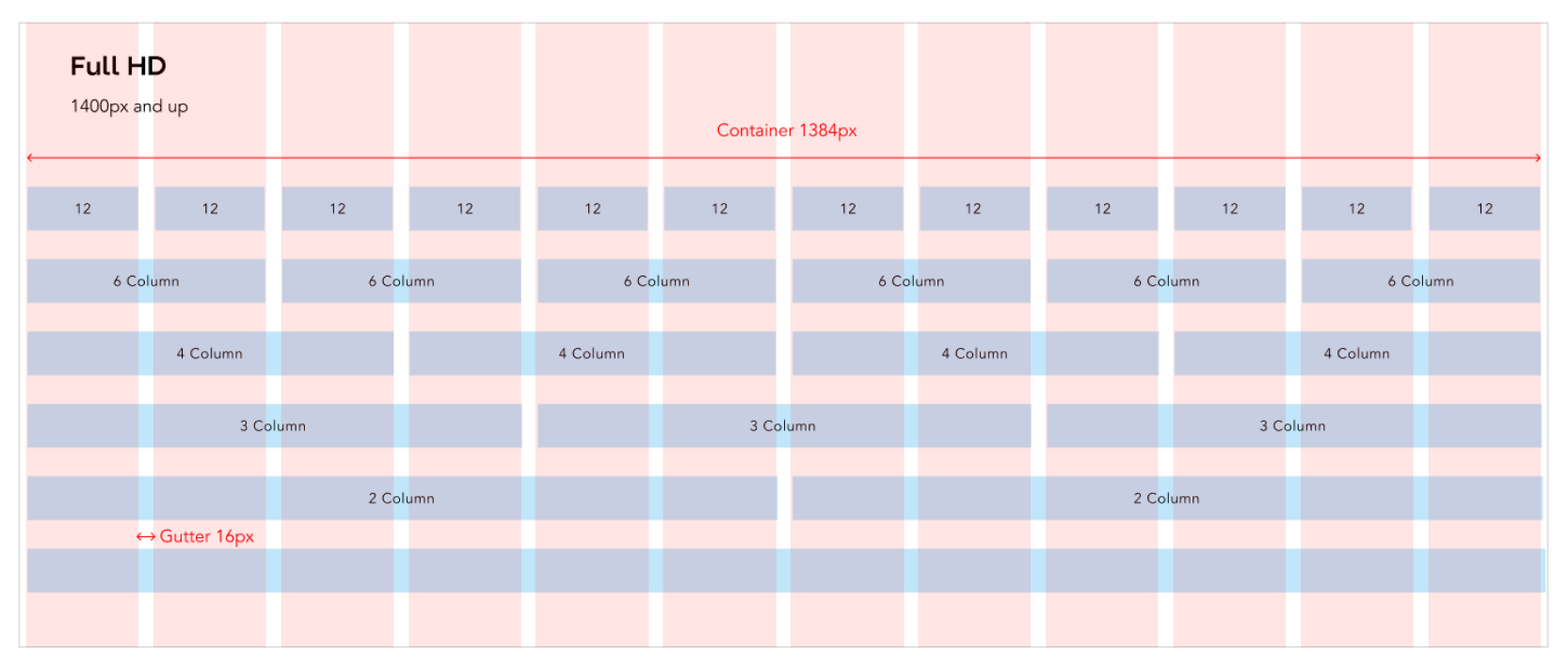 AUO Design System 採用 12 欄網格系統。欄與欄之間的間隔 (Gutter) 設為固定值 (公式:(16+8n) px,n 為自然數),瀏覽器寬度在一定範圍內變化時,欄寬會隨之調整,但間隔保持不變。