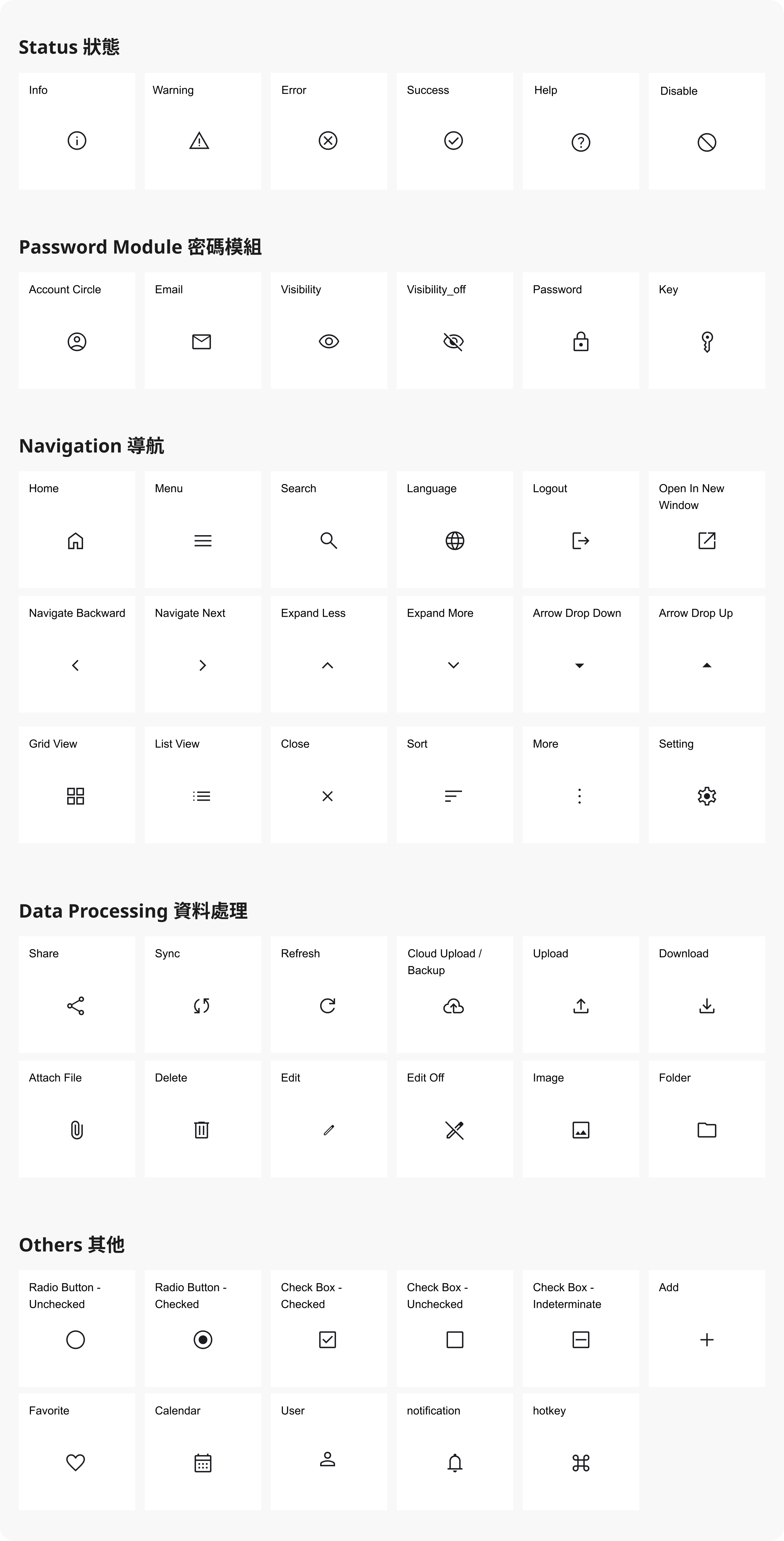 - 互動狀態:圖示在不同狀態下(如預設、懸停、按下、禁用)應有適當的視覺變化,提供明確的回饋。互動規則請參考 Buttons-Icon Button。