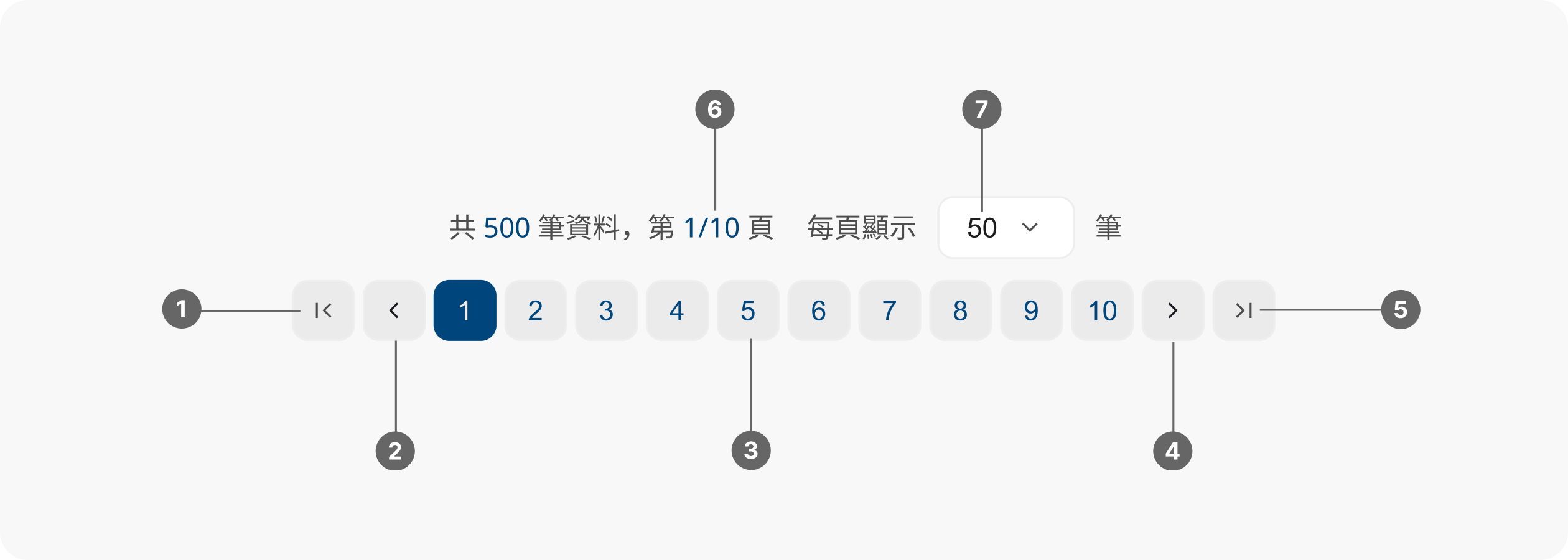 - 每頁資料筆數選單 (Items Per Page Dropdown)(選擇性):每頁顯示 10/50/100 筆。