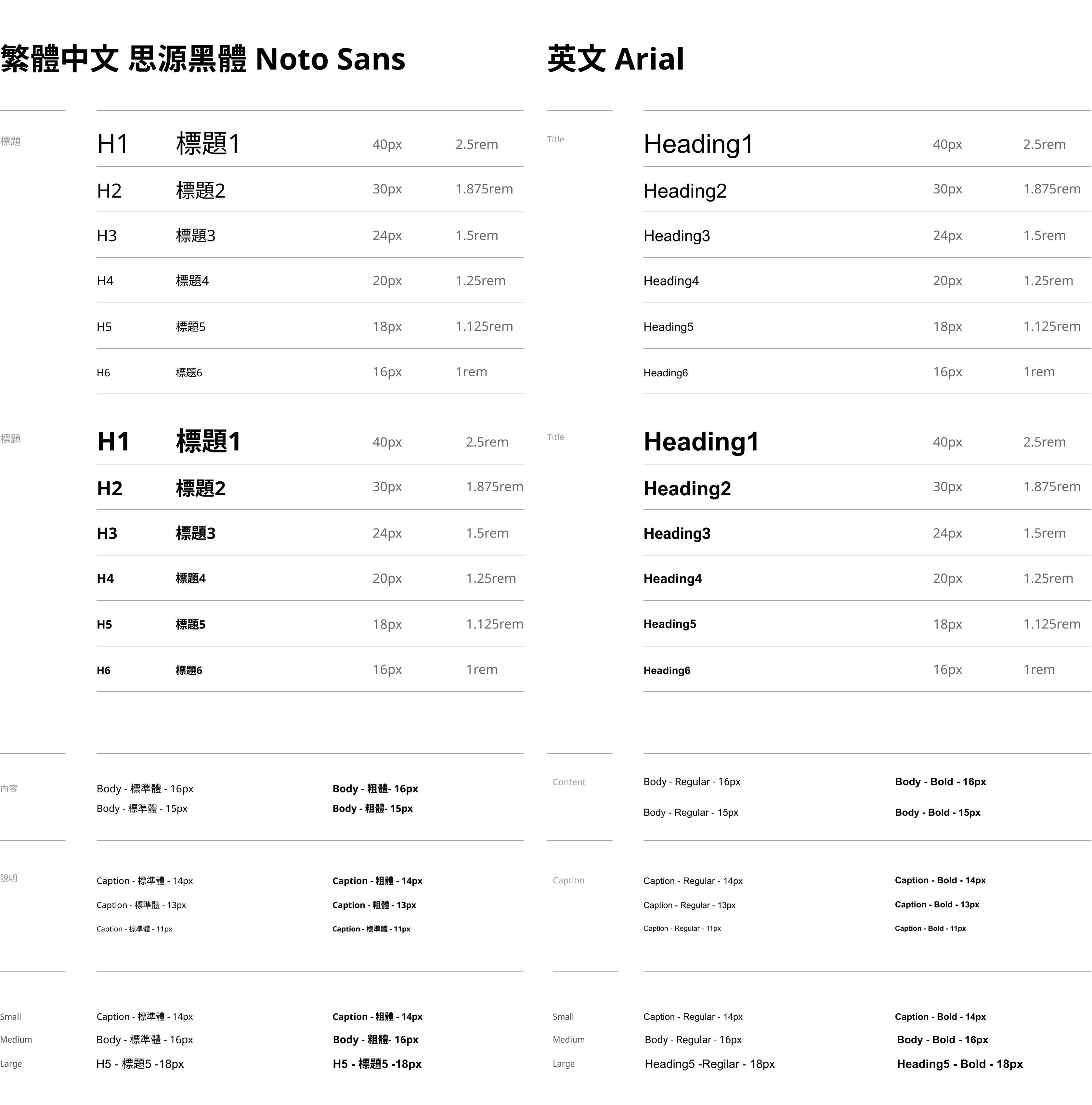 AUO Design System 提供思源黑體與 Arial 作為主要中、英文字體,並提供不同字重 (Weight) 和樣式 (Style) 的字體以建立視覺層級: